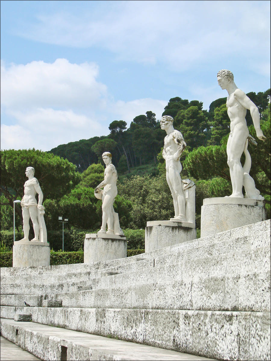 The Foro Mussolini is more than a mere re-construction of Roman circuses, it is a central component of what Mussolini described as modern ‘rational and functional architecture.’ Mussolini thus subdues architecture to ideology. In this way, the Foro Mussolini pictures a rational, unitary Italian soul inherited from the wise Romans, and functions as an instigator of Fascist values of strength, virility, obedience, and discipline. This is what modernity is all about for the Duce: Re-modelling a Roman past to suit the political endeavours of an all-prevailing Italy. To this end, a return to classical forms in art was imposed in Italy from 1922 onwards. The Novecento Italiano reinvented simplicity, massive designs, Roman columns, and rectangular shapes. Reinvented, not copied, for fascism paradoxically harboured both concepts of tradition and revolution at its core. Therefore, the essence of those beauty standards was Fascist, not Roman. The project of the ‘Renovatio Romanorum’, the Roman Renovation initiated by Antonio Muñoz, strikingly shows how the recovery of body and spirit became a necessity to build Fascist Italy. Here lies the purpose of the Foro Mussolini: To build, in the most literal sense, that is physical, a new, modern order. It is therefore a political statement, one which asserts the absolute superiority of an eternal Italian nation and justifies combative force as a natural outgrowth of its nature in a period of colonisation.