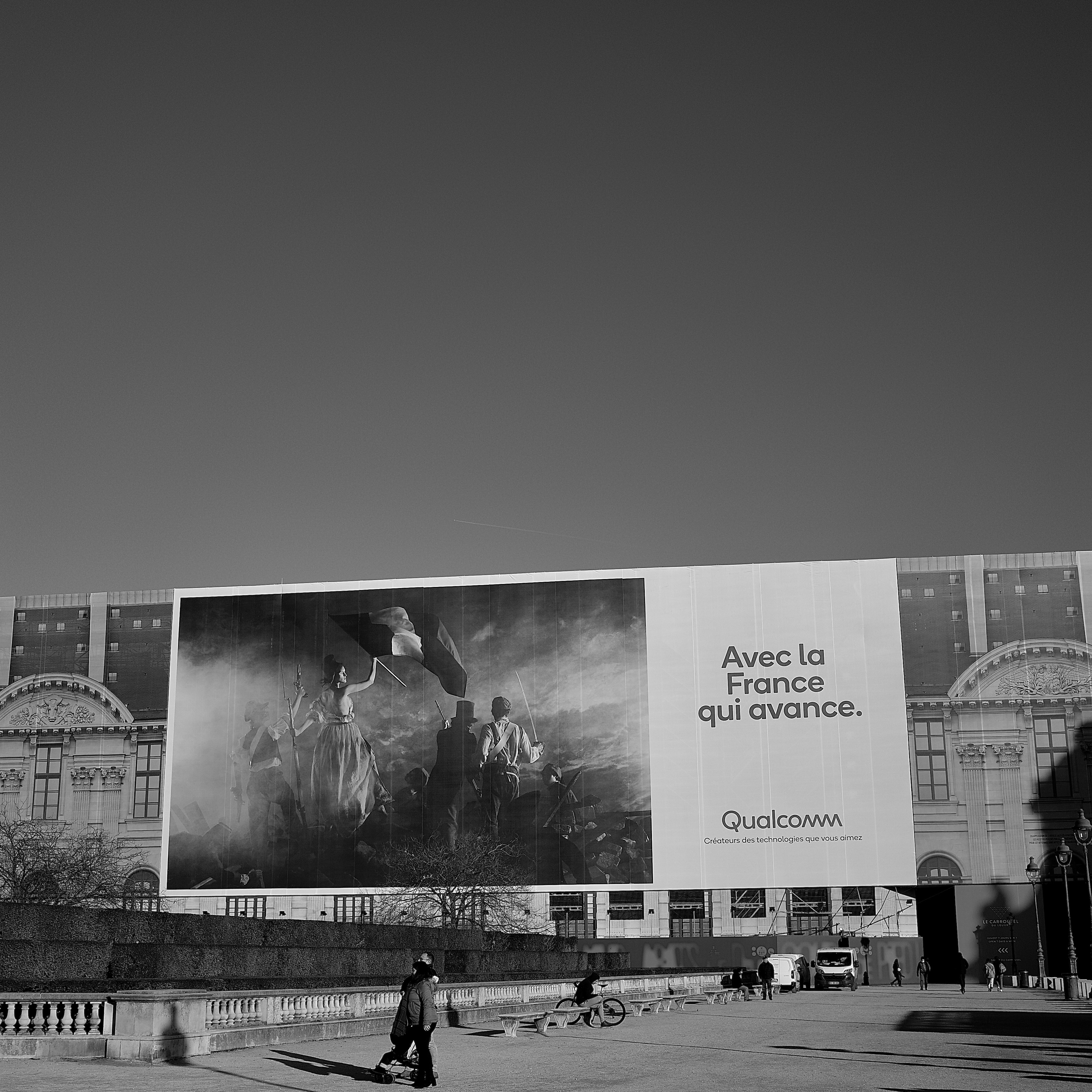 Our second image shows the Richelieu Wing of the Louvre in renovation. The large scale of the renovations contrasted with the people standing in front of them, which represents the sizable efforts of the French government in preserving historic and cultural monuments. The advertisement on the scaffolding displays a painting of the personification of the French Republic, Marianne, waving a French flag in the setting of the Revolution, and reads ‘Avec la France qui avance.’ (With France moving forward). The painting of Marianne thus uses metaphorical expression to remind bypassers of the national symbol of French identity, as well as the creation of the French Republic. Meanwhile, the quote besides the painting directly denotes the rich future ahead of the nation, thence consolidating French national identity.