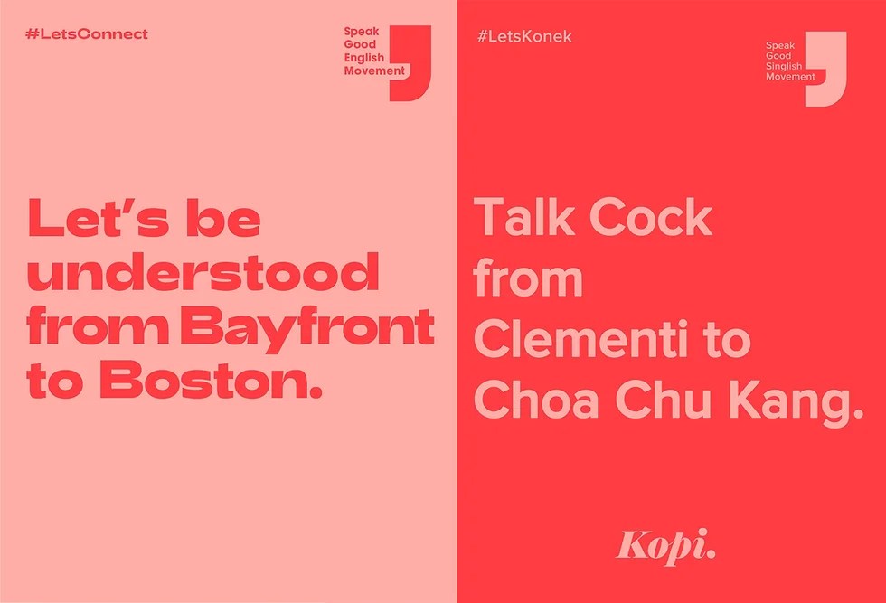 Figure 1: A side-by-side comparison of posters from the Speak Good English Movement and the satirical Speak Good Singlish Movement. (Source: Speak Good English Movement & thekopi.co)