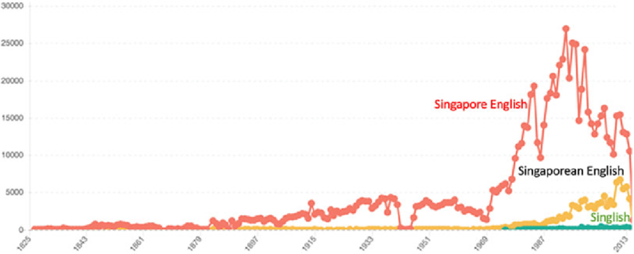 Figure 2: Appearances of terms in local newspapers. (Source: The curious case of nomenclatures: Singapore English, Singlish, and Singaporean English & eresources.nlb.gov.sg)